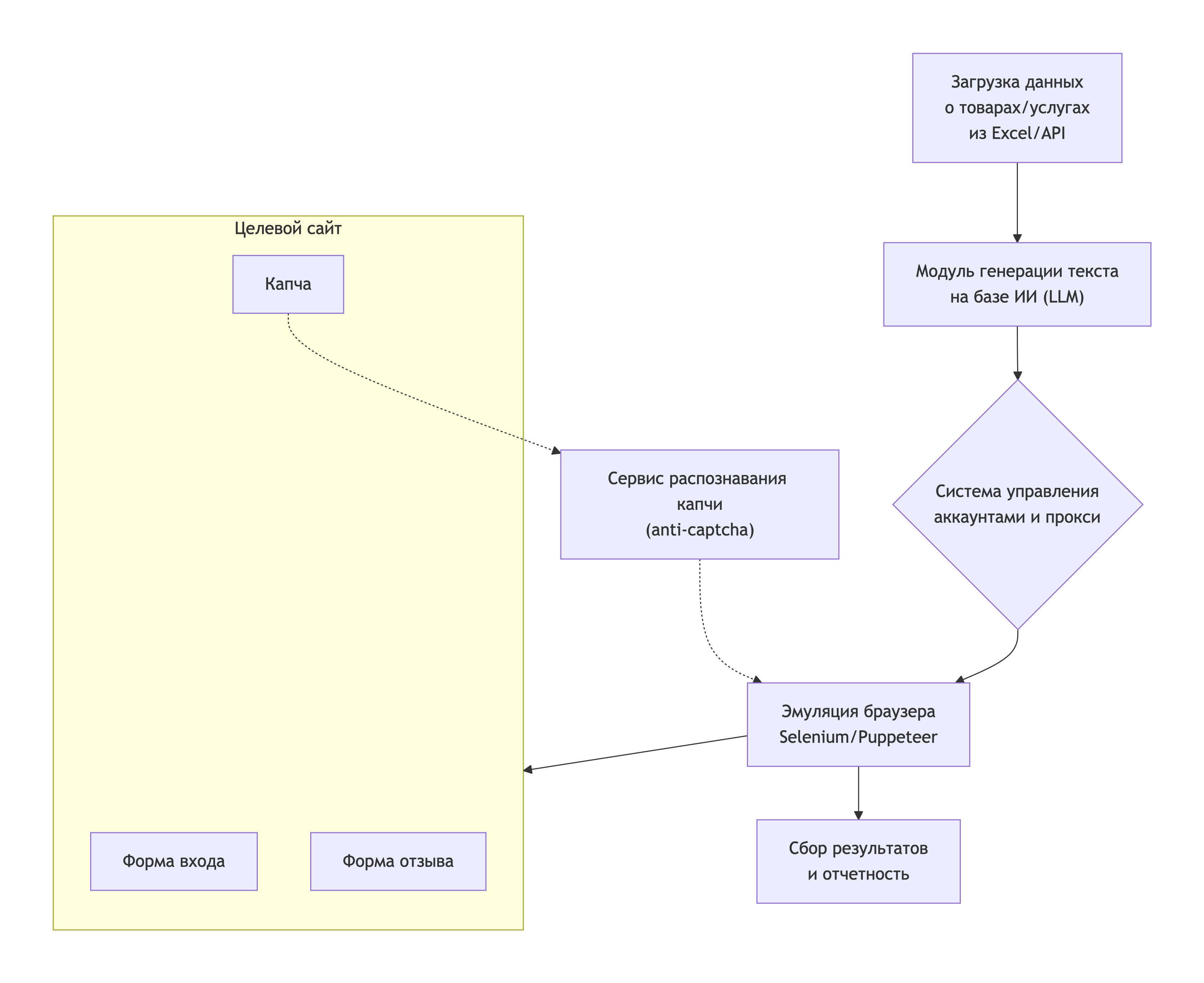 Эмуляция поведения: Просто зайти и написать отзыв — подозрительно. Бот должен имитировать поведение человека: скроллить страницу, задерживаться на разных элементах, двигать мышью . Для этого используются фреймворки для автоматизации браузеров, такие как Selenium или Puppeteer.